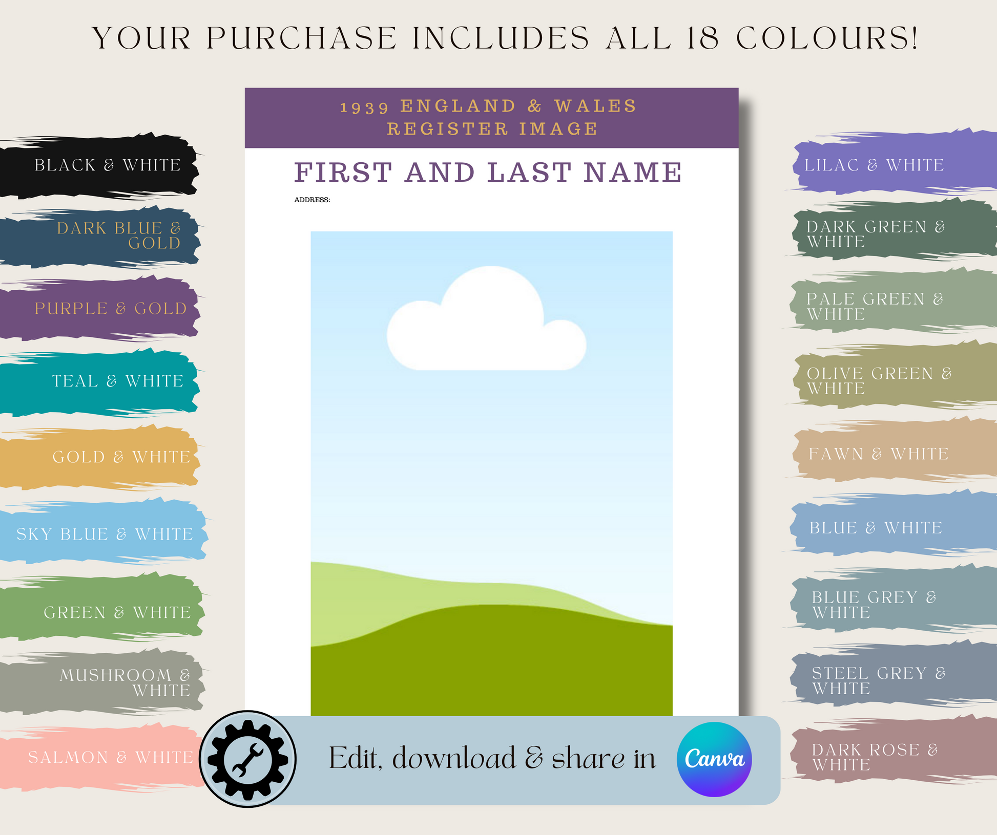1939 England & Wales Register Record Template for Family History Organisation (CANVA)