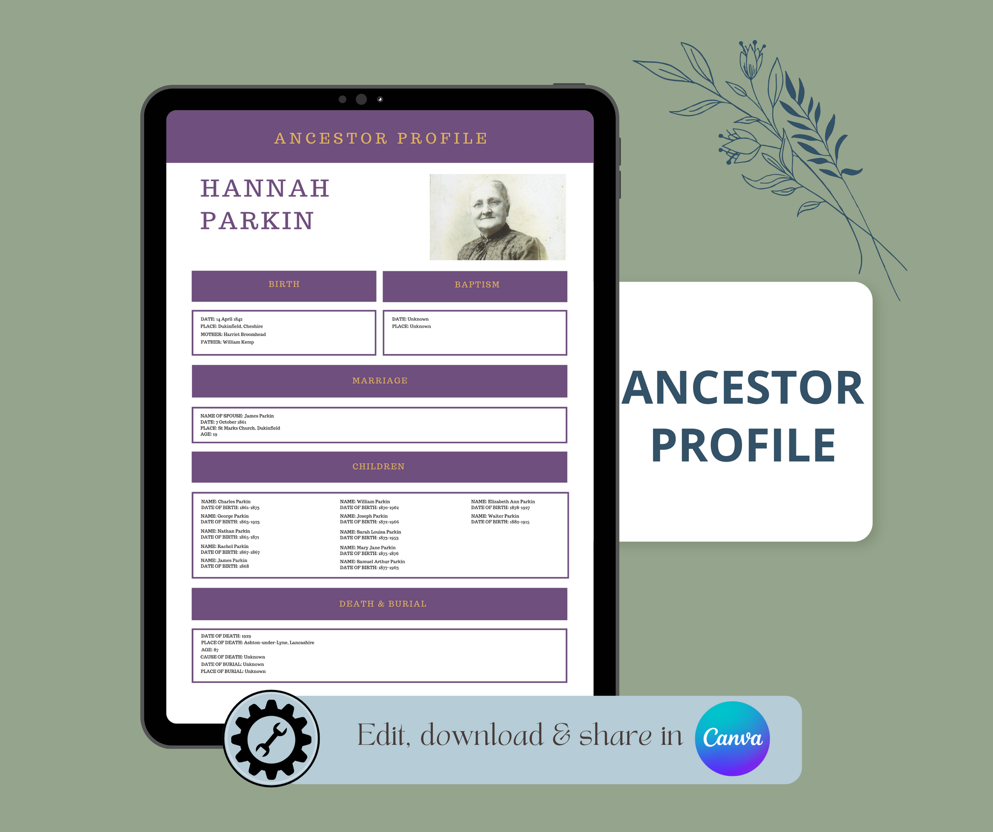 Ancestor Profile Template for Family History Organisation (CANVA)