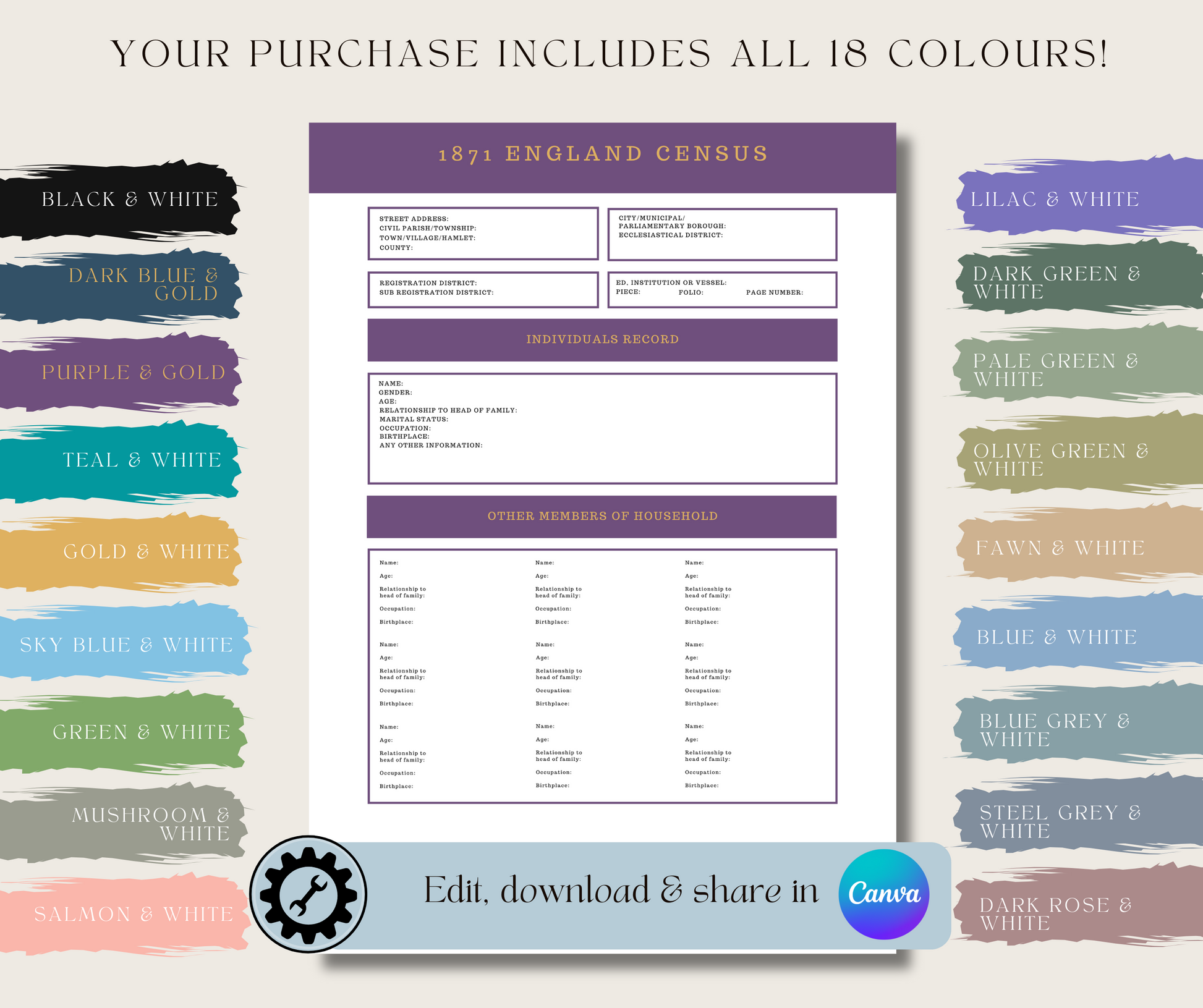 A 12-page census record template in 18 different colour schemes. This includes black & white pages for low cost printing.
