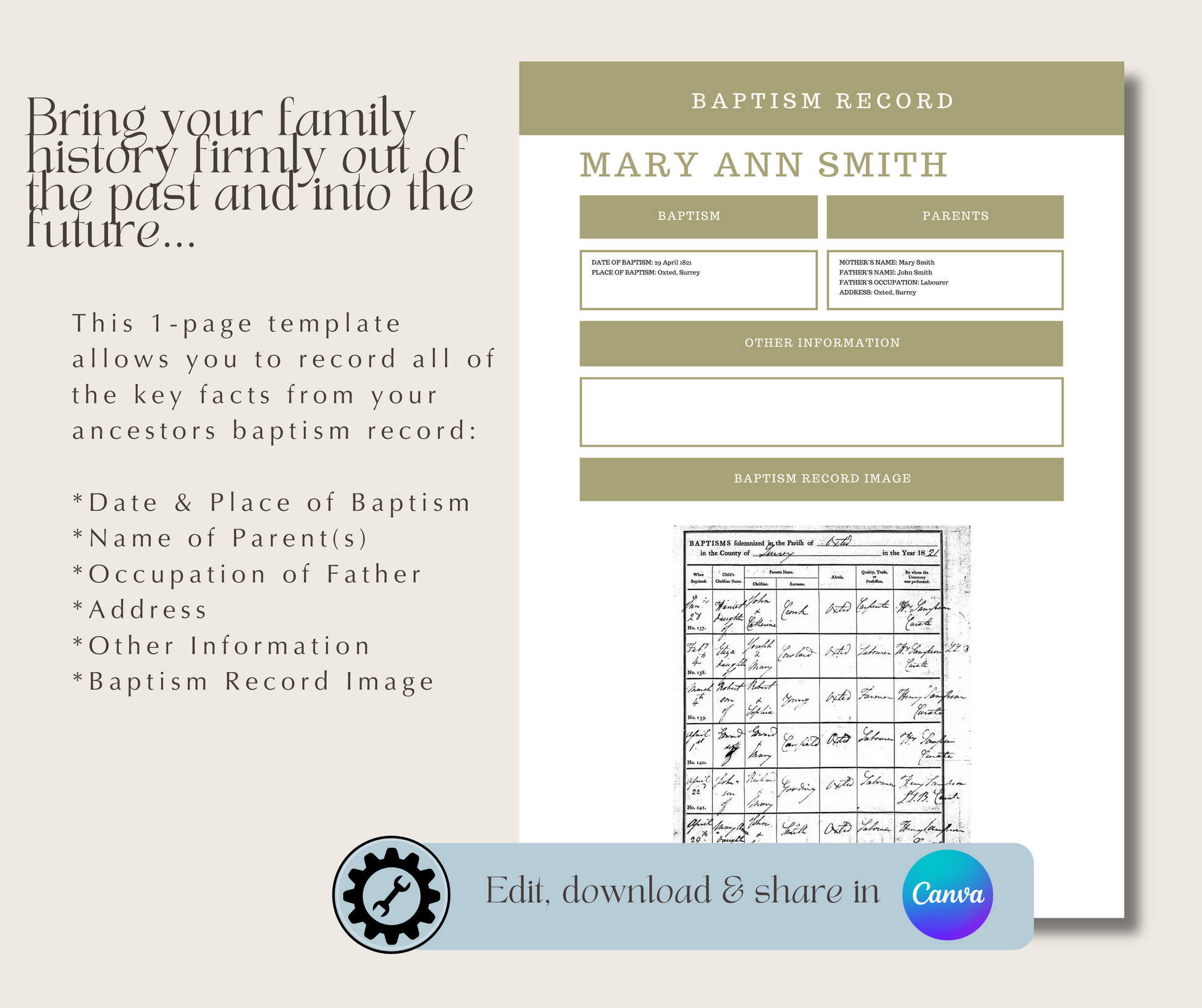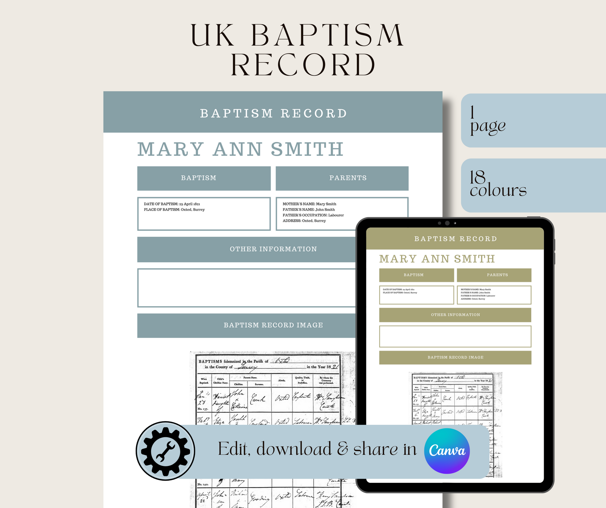 UK Baptism Record Template for Family History Organisation (CANVA)
